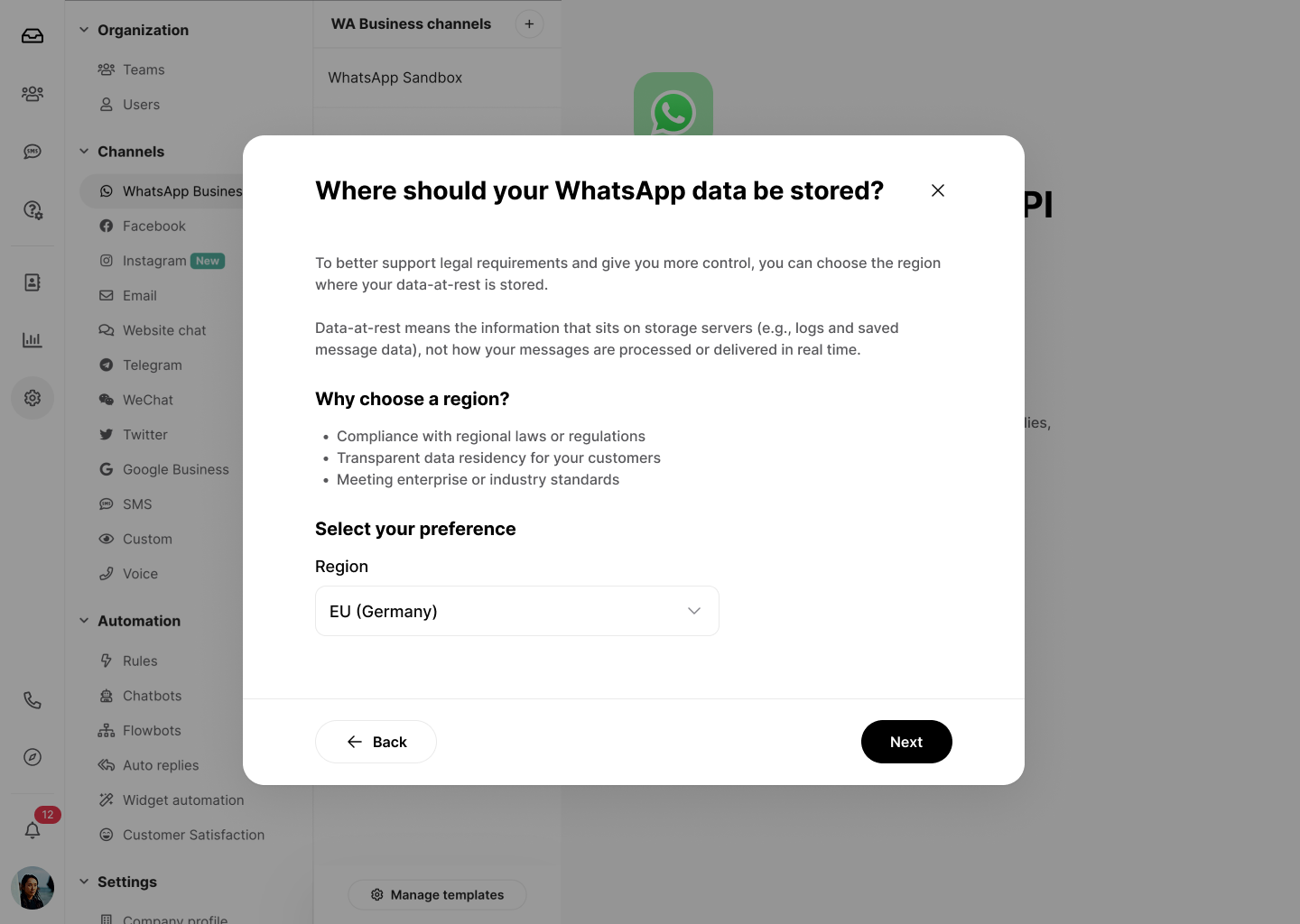 - Select Data Region: You will be prompted to select your preferred region for storing WhatsApp data.