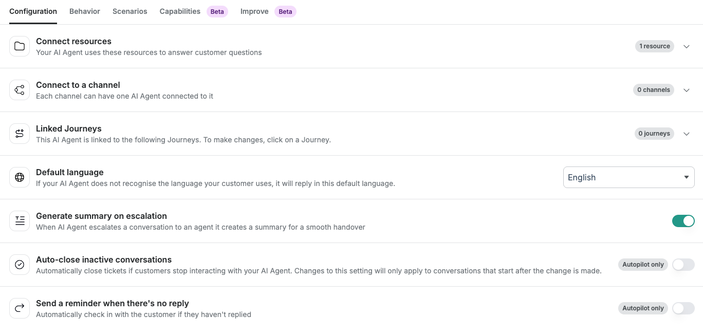 Learn how to set up and configure your AI Agent so it can handle conversations, use knowledge, and automate workflows effectively.