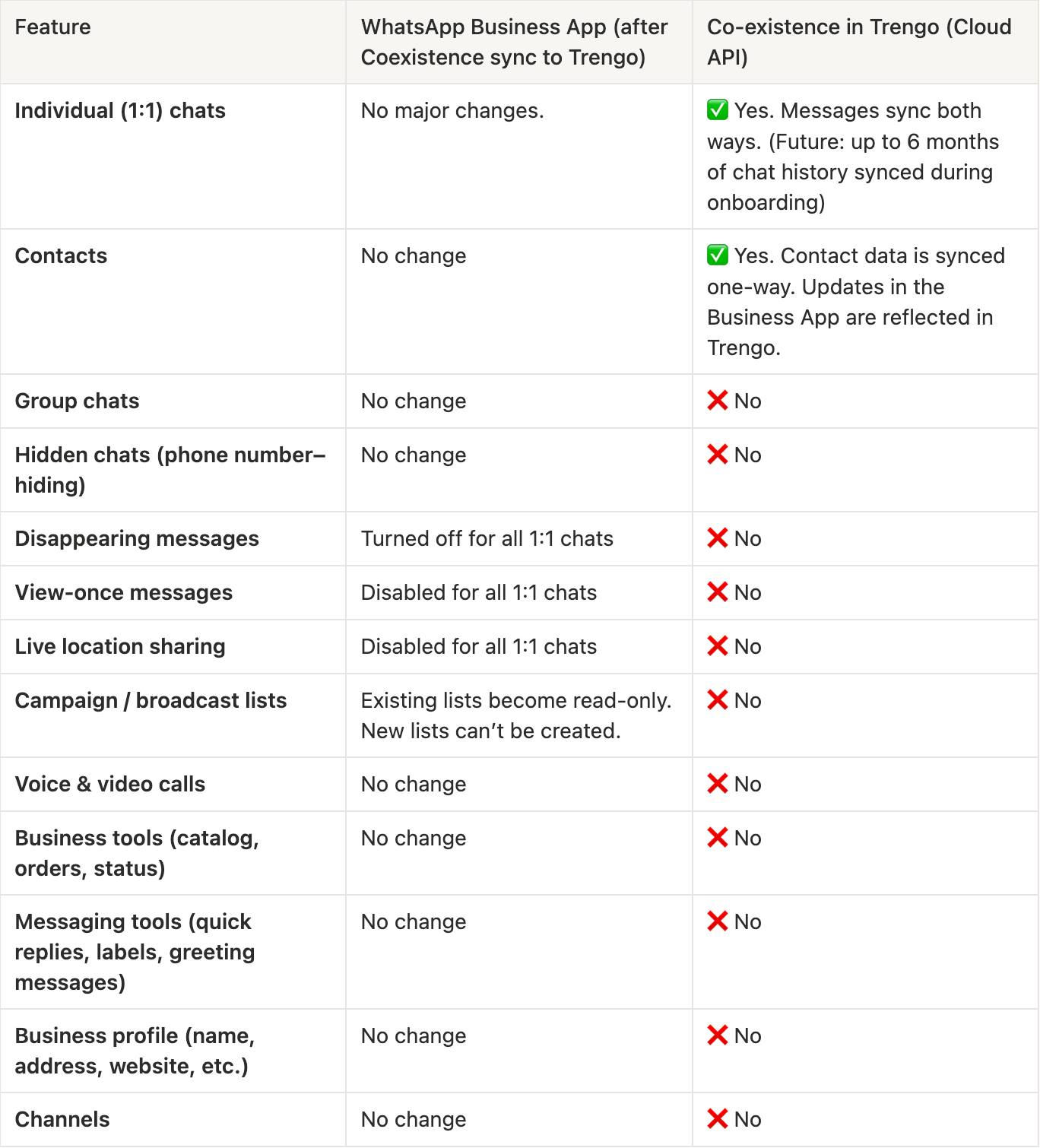 Some app features (like broadcast lists or disappearing media) may not work when coexistence is enabled.